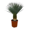 - Uiterlijk van de Yucca Rostrata: De Yucca Rostrata heeft dunne, blauwe tot grijsgroene bladeren die een sierlijke rozet vormen. De bladeren zijn stevig en kunnen een spitse vorm hebben, wat de plant een scherpe uitstraling geeft. De stam is verhout en dikker in de basis, met een unieke, ruwe textuur die bijdraagt aan de robuuste uitstraling van de plant.