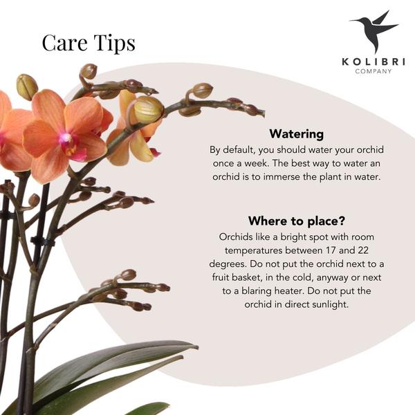 Geef jouw orchidee één keer per week water door de kweekpot onder te dompelen in het water. Laat de orchidee hierna goed uitlekken voordat je de kamerplant terug in de sierpot zet. Kies een lichte plek uit, maar niet in direct zonlicht, met kamertemperaturen tussen 18 en 21 graden. Zet de orchidee daarnaast niet in de buurt van een kachel of verwarming.