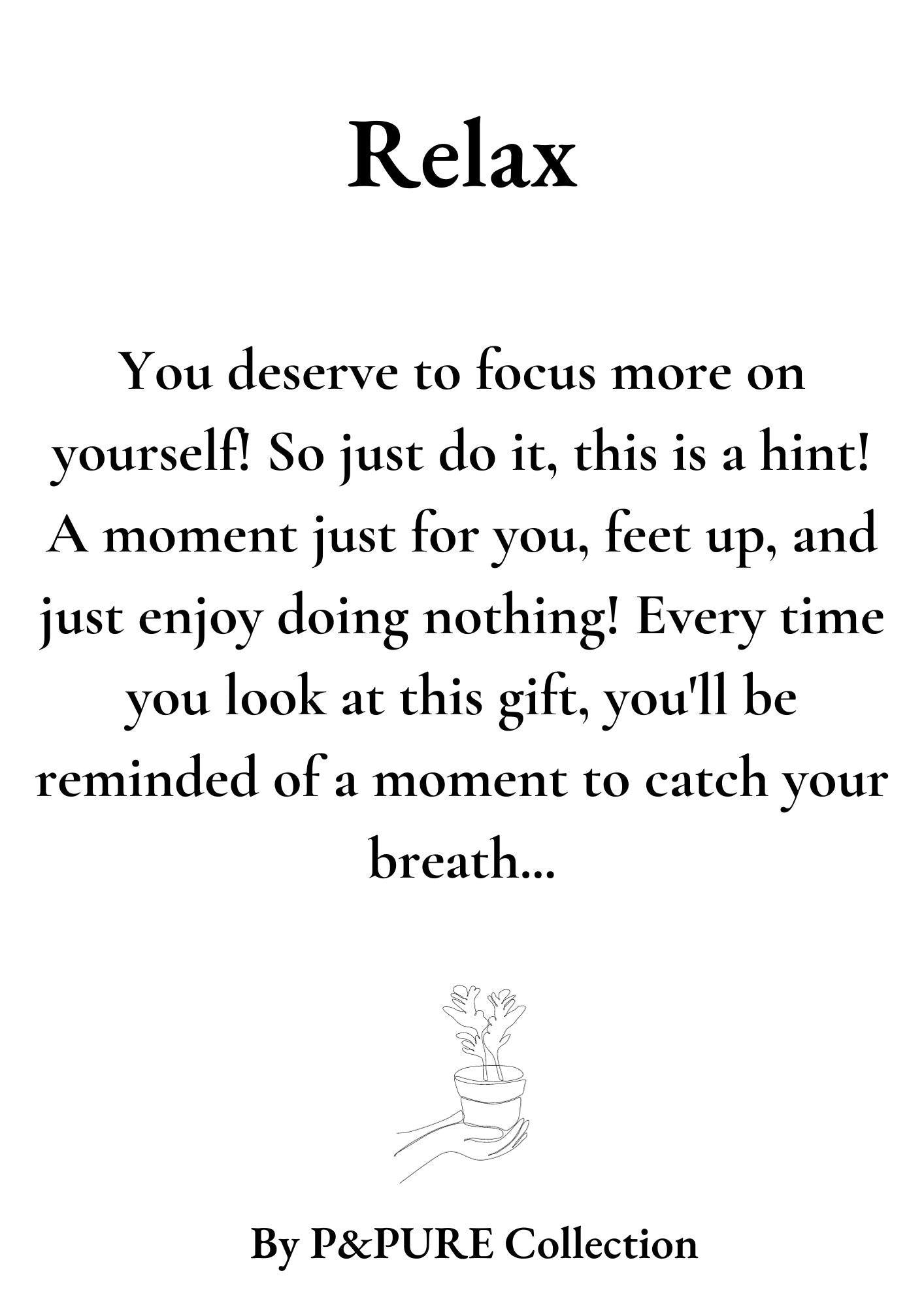 - Wordt geleverd met een stijlvolle wenskaart met de boodschap "Relax", perfect als rustgevend cadeau.